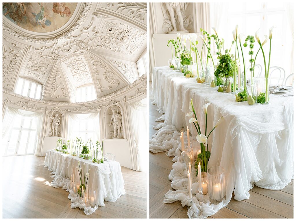 The Fürstenbau Hacklberg in Passau provided the breathtaking, light-flooded setting for this styled shoot. The bright architecture with baroque elements and paintings set the festive table as the central element in a festive setting.