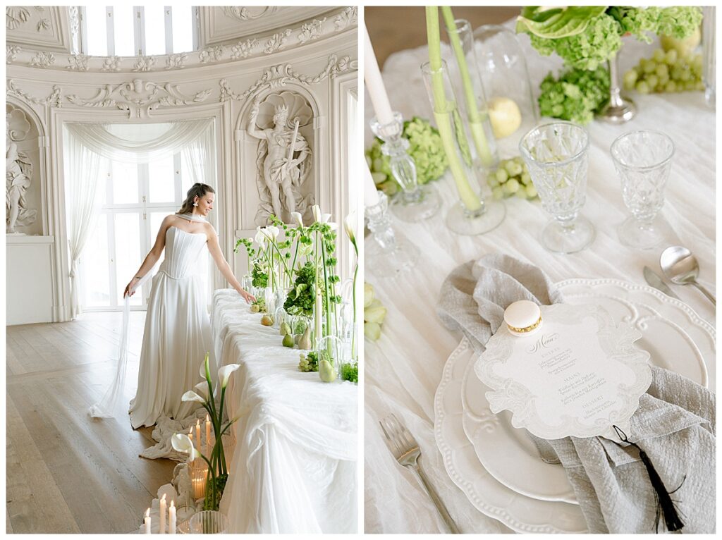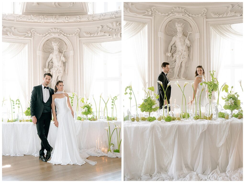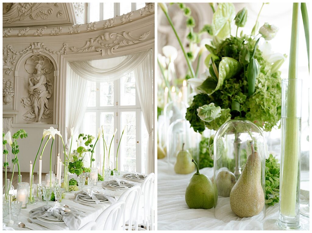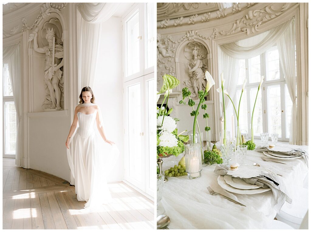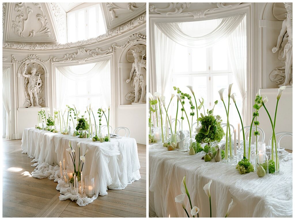 This styled shoot showed how powerful a reduced world of color can be when materials, proportions and details are perfectly coordinated. White and green, lush fabrics, floral lightness and architectural richness combined to create a harmonious overall concept that appeared timeless, elegant and extraordinary.