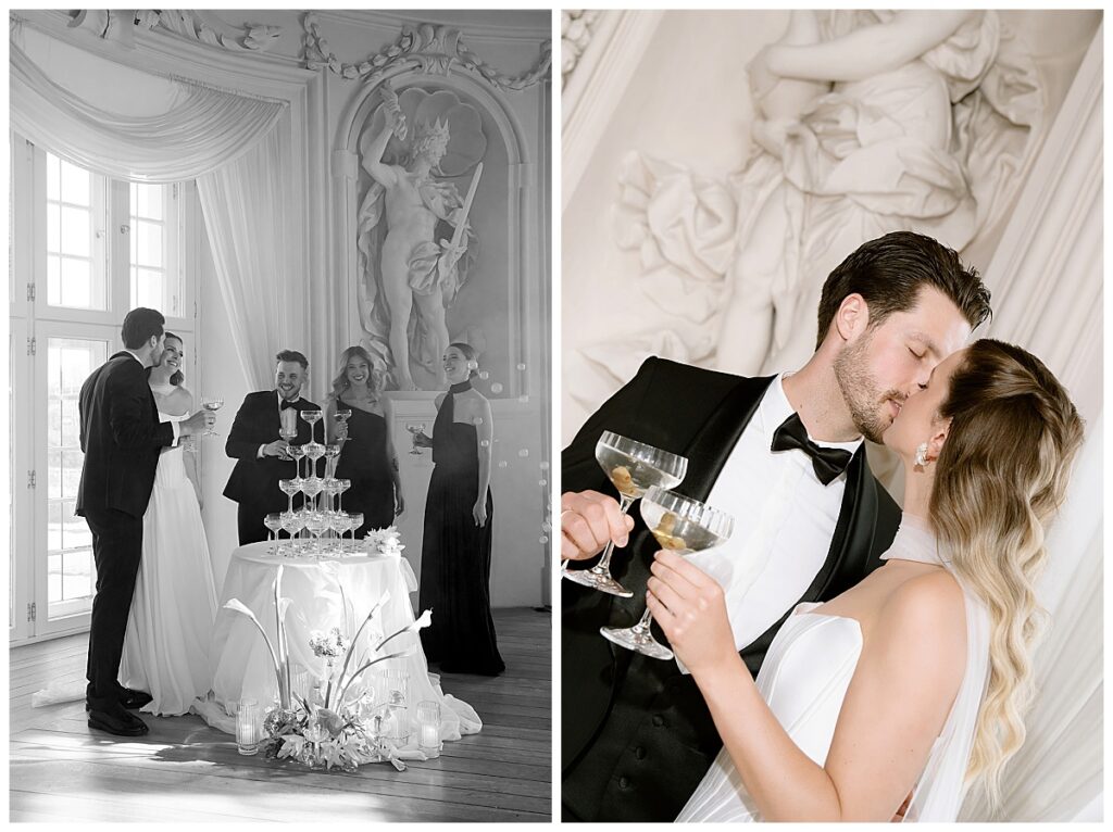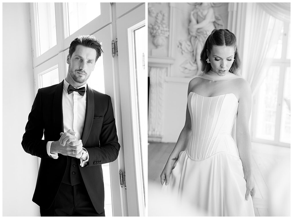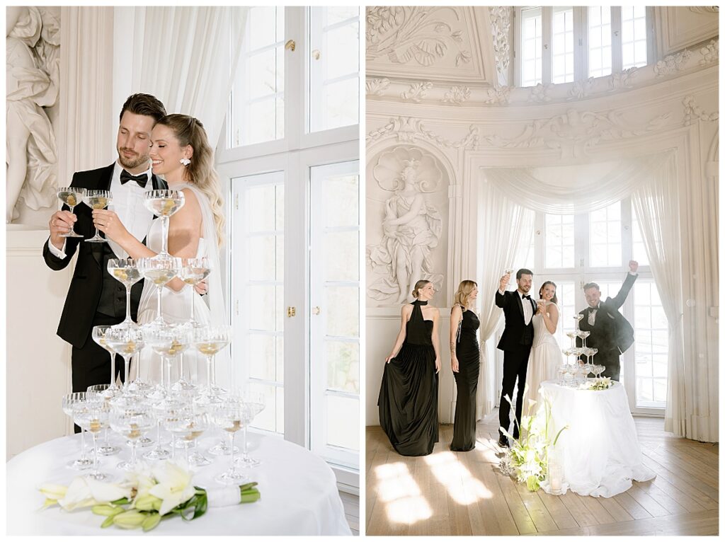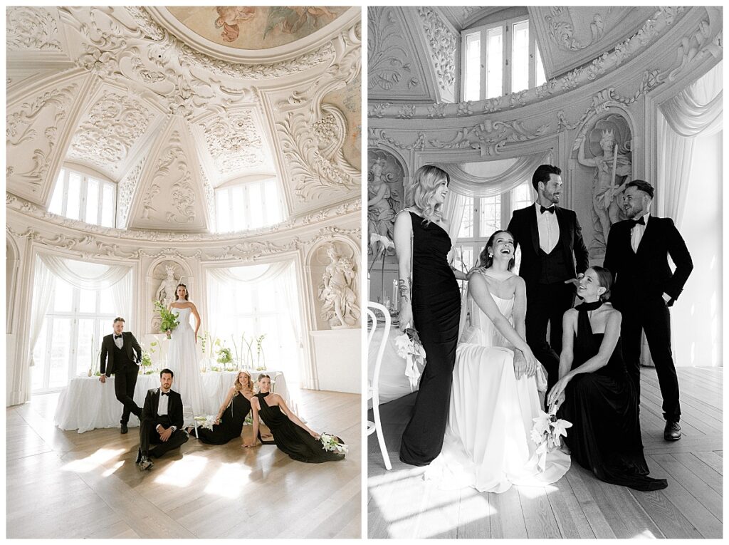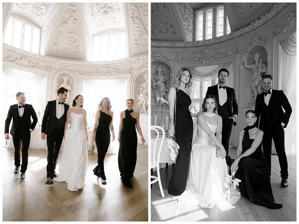 An exciting contrast was created by the dress code of the guests and the groom. Black tie and black evening wear contrasted with the white of the bride and the festive table. Black and white reinforced each other and gave the shoot a special clarity and modern elegance.