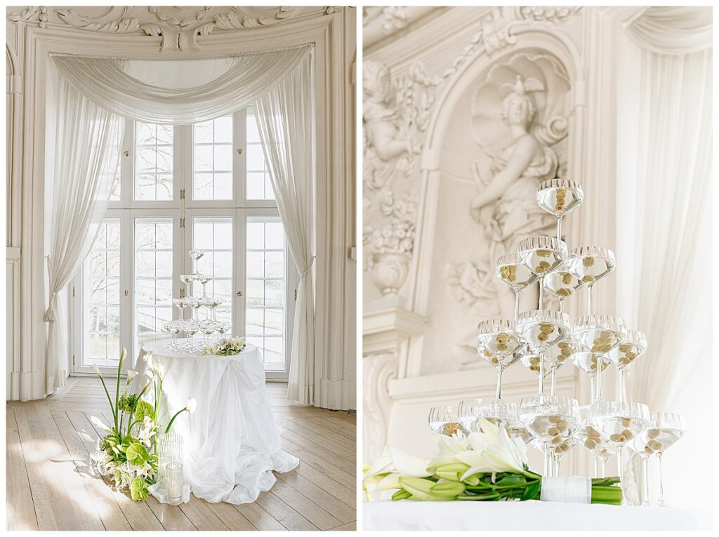 The concept was rounded off with a gleaming white wedding cake, accompanied by fine pastries from Mehlgestöber. Presented on white pillars and decorated with the same white and green flowers as on the banquet table, it blended naturally into the overall picture. A champagne pyramid provided a further elegant accent. The couple and their friends ended the day with champagne, quiet conversation and a relaxed atmosphere.