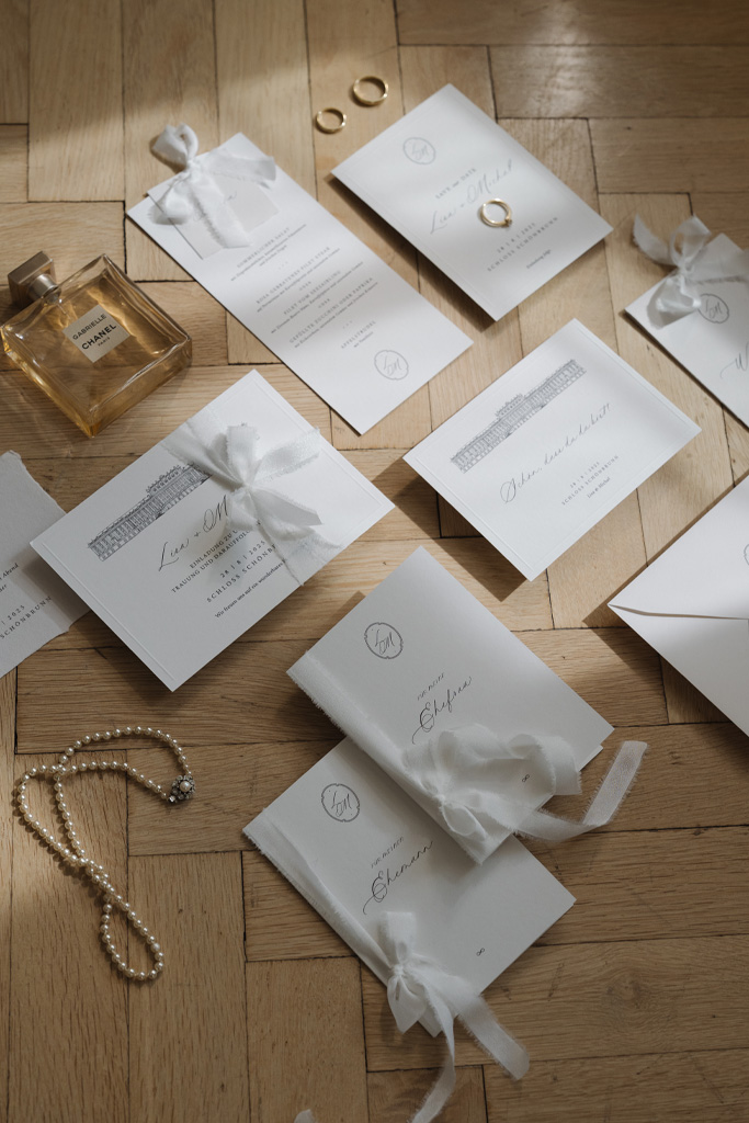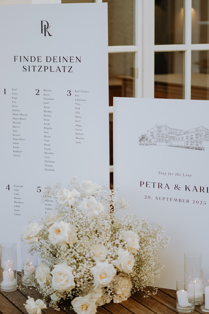 From bespoke designs created exclusively for you to elegant collections that can be adapted to your wishes – everything is created with great attention to detail and the aim of perfectly reflecting your big day. The range is complemented by tasteful rental items such as decorative frames, table numbers or arrangement elements to add the perfect finishing touch to your celebration.