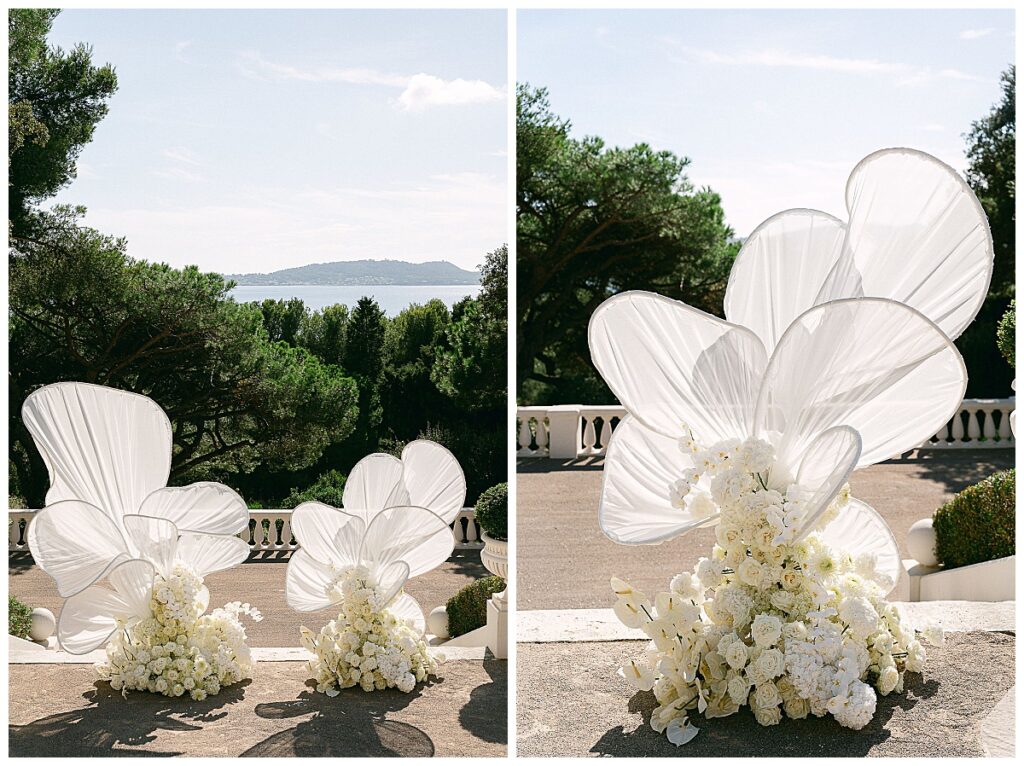 The free wedding ceremony took place on one of the central garden terraces with a view of the sea. Two large white floor bouquets marked the ceremony area. Behind them rose organically curved fabric elements, reminiscent of oversized petals or wings. The installation was deliberately asymmetrical, projecting well beyond the silhouette of the groom and looking like an artistic sculpture in motion.