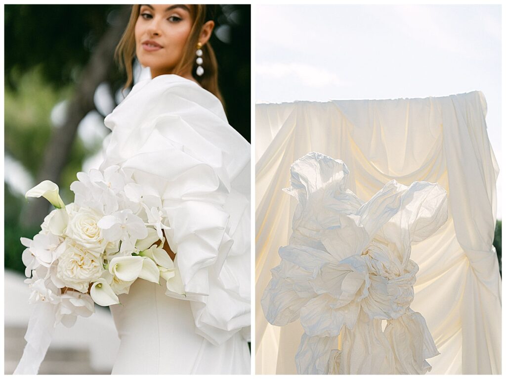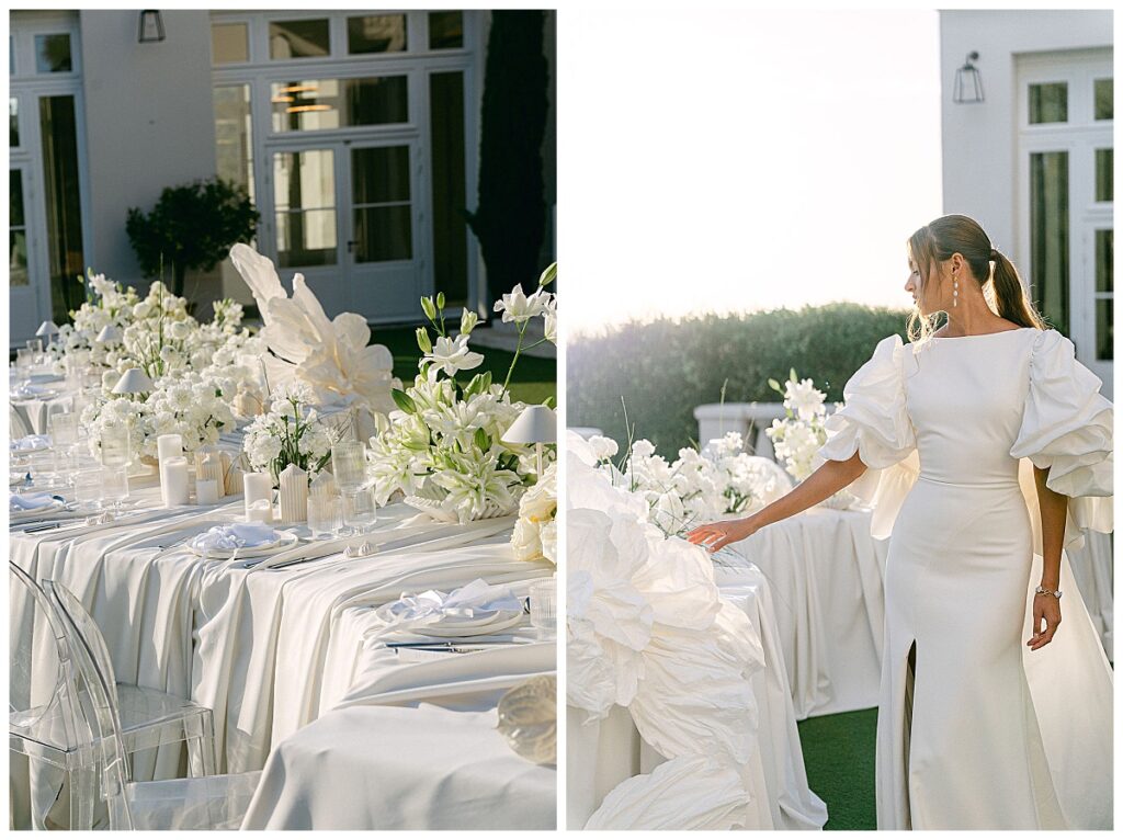 This White Seaside Wedding editorial told a luminous, poetic story of modern elegance, Mediterranean tranquility and timeless clarity. The combination of architecture, floral art, sculptural staging and modern bridal fashion made this shoot an inspiration for couples wanting a white seaside wedding with a modern, elegant aesthetic.