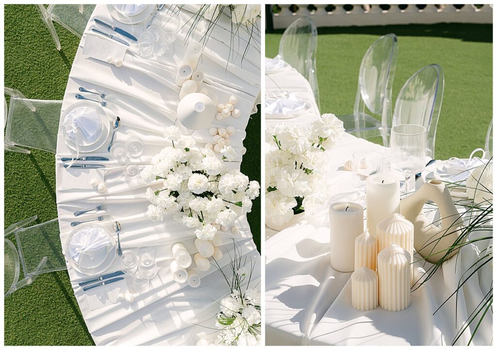 Another highlight of the shoot was the organically curved table in the garden. Several gentle S-lines stretched across the lawn directly in front of the house. The table was completely white, with flowing draped table linen, white candles and floral arrangements.