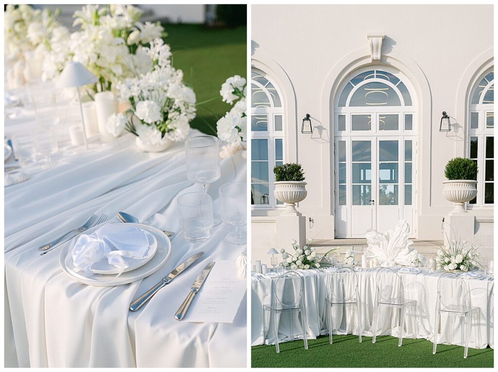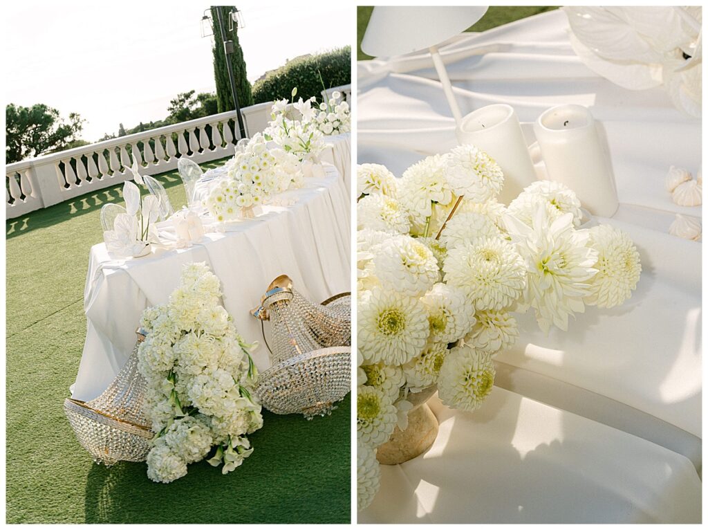 The floral design was created by Celine Braun and followed a consistent monochrome approach. The bridal bouquet consisted of white roses, hydrangeas, callas and orchids and emphasized the consistently monochrome design. On the tables, the floral concept was complemented by other white summer flowers, occasionally interspersed with delicate greenery, such as fine blades of grass, which lent the arrangement a subtle lightness.