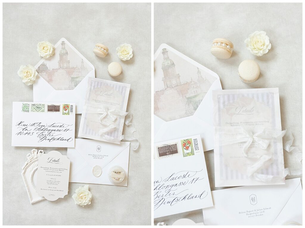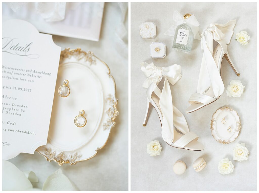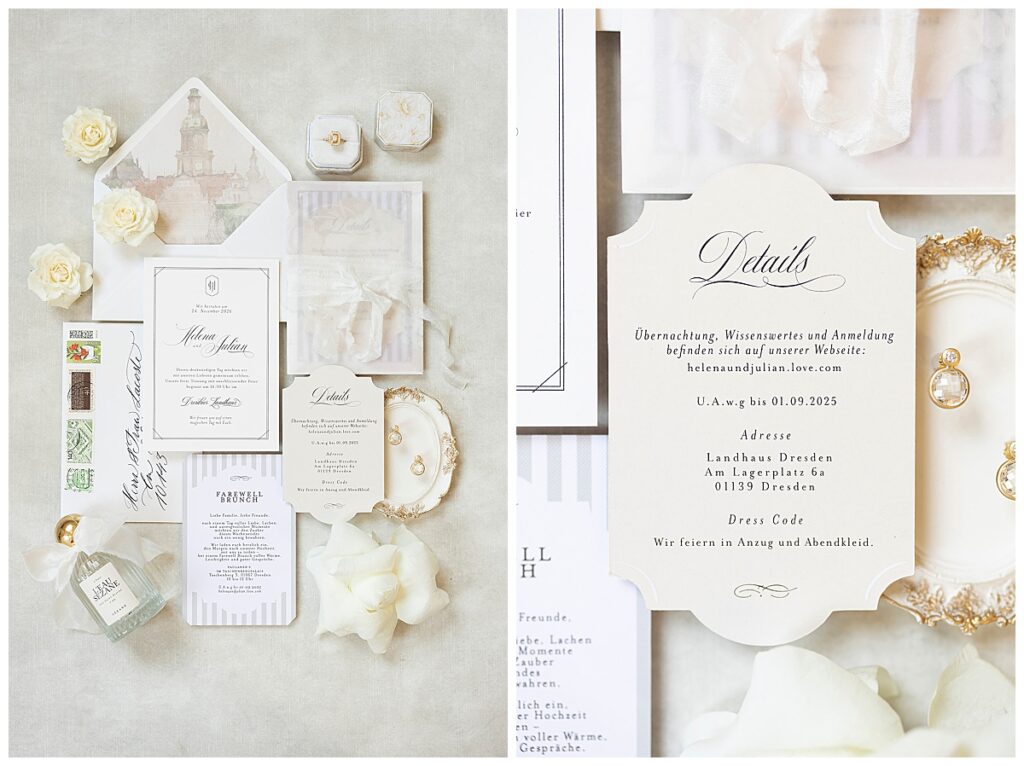 Planning & Concept: Frame The Journey I Photography: Sophie Gestrich I Videography: Manoora I Location: Landhaus Dresden I Floristry, Decoration & Concept: Wolf Concepts I Hair & Make Up: Isabell Klause I Wedding dress: Blush & Bleu, Millanova I Men’s outfit: Stella Brautmoden I Shoes: Bella Bella Shoes I Watch: Union Glashütte, Scholze Uhren & Schmuck I Rings and jewelry: Einzigartiger Schmuck I Stationery: Bonjourpaper I Cake and sweets: MY Cakes & Sweets I Champagne: Ruinart I Flatlay Props: Light Atelier UK I Flatlay mat: Marry and Lilo