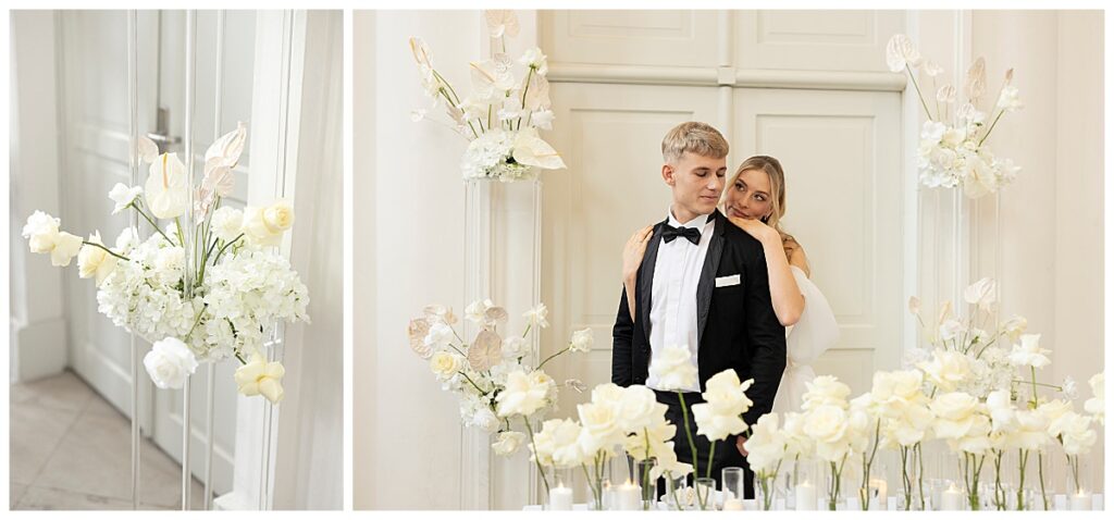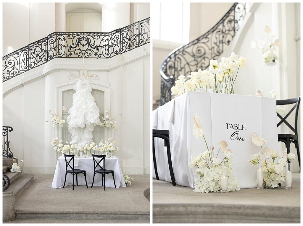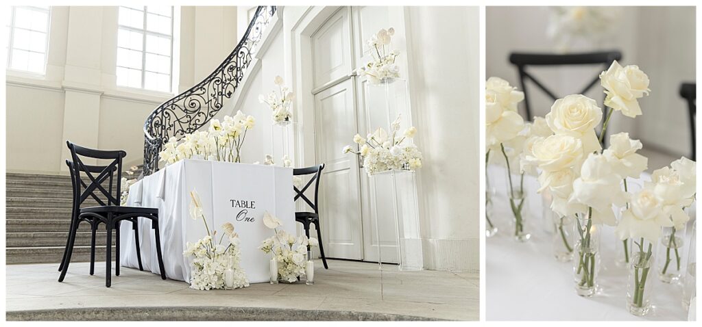The concept followed a clear design line. White and ivory determined the entire staging, supplemented by fine silver details and deliberately used black accents derived from the architecture. Color was deliberately avoided. Instead, tension was created through contrasts between shiny glass and soft fabrics, between floral lightness and architectural precision.