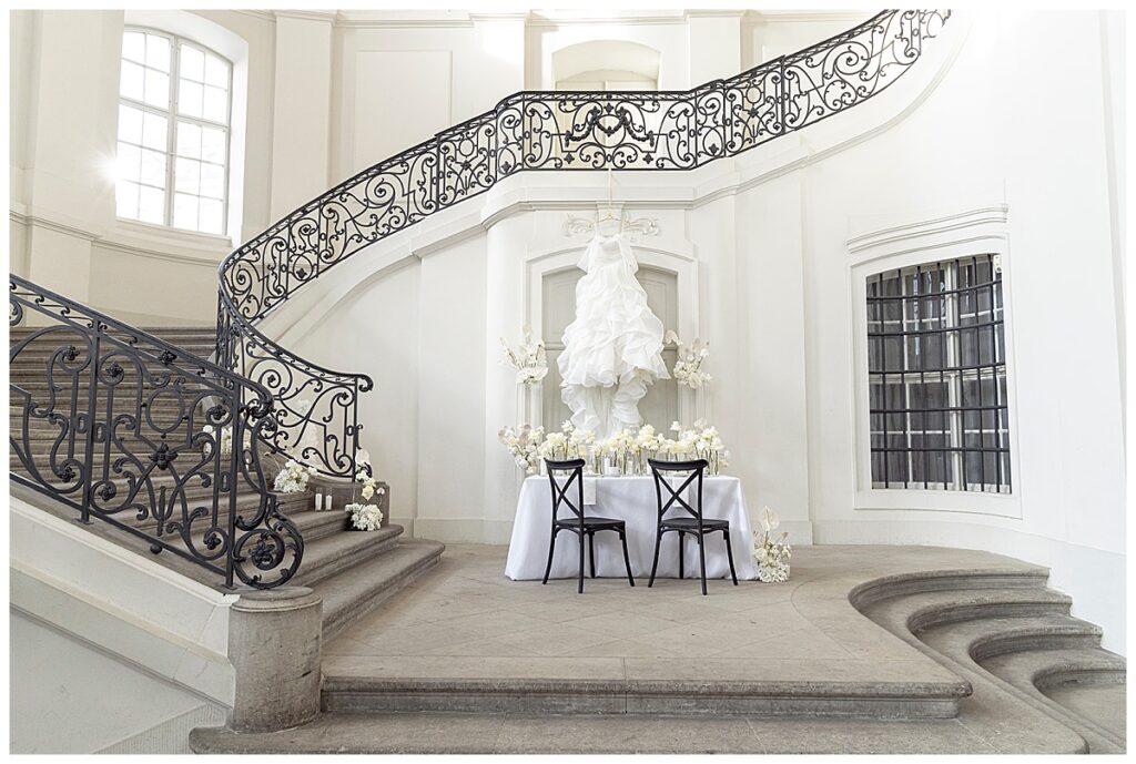 With its monumental room height, curved wrought-iron railings and clear white surfaces, the historic architecture of the Landhaus Dresden created a stage of particular tranquillity. Gentle daylight fell through large arched windows and allowed materials, textures and shapes to come to the fore. The classic symmetry of the room lent the entire setting a timeless, almost museum-like atmosphere.