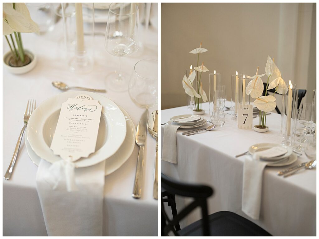 The floral design by Wolf Concepts picked up on the minimalist aesthetic and developed it further as the day progressed. In the afternoon, open roses in soft white and ivory tones dominated. Loosely arranged in glass vases, they created a calm, romantic atmosphere. The scenery changed with the transition into the evening. The soft shapes gave way to clear, ikebana-inspired compositions of white anthuriums. The arrangements now appeared more graphic, more structured and deliberately set architectural accents.