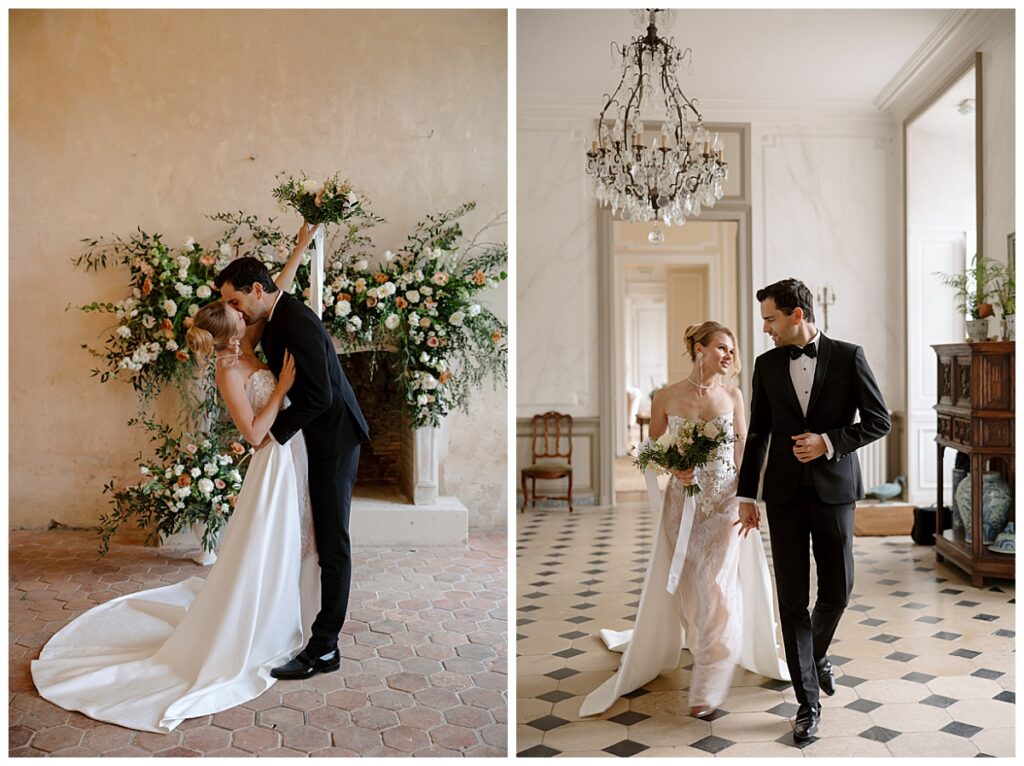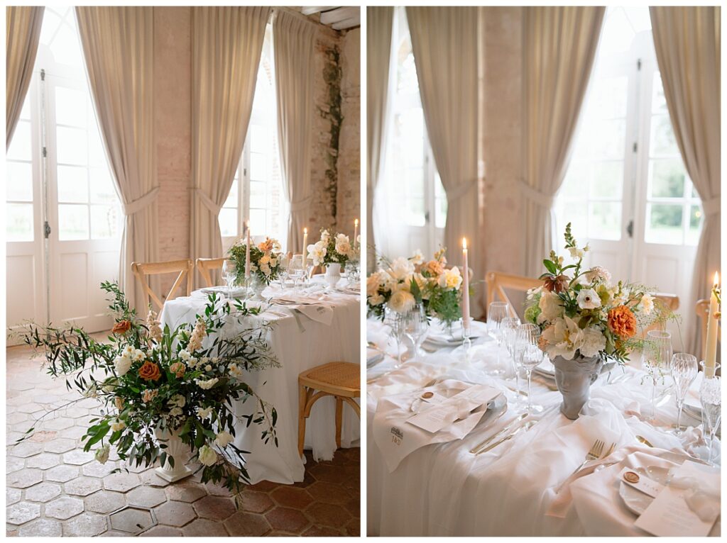 The floral compositions by Fleurs et Pépins created an atmosphere full of lightness. Pastel tones, delicate blooms and natural movement picked up on the château’s delicate architecture and created a harmonious flow throughout the wedding inspiration.